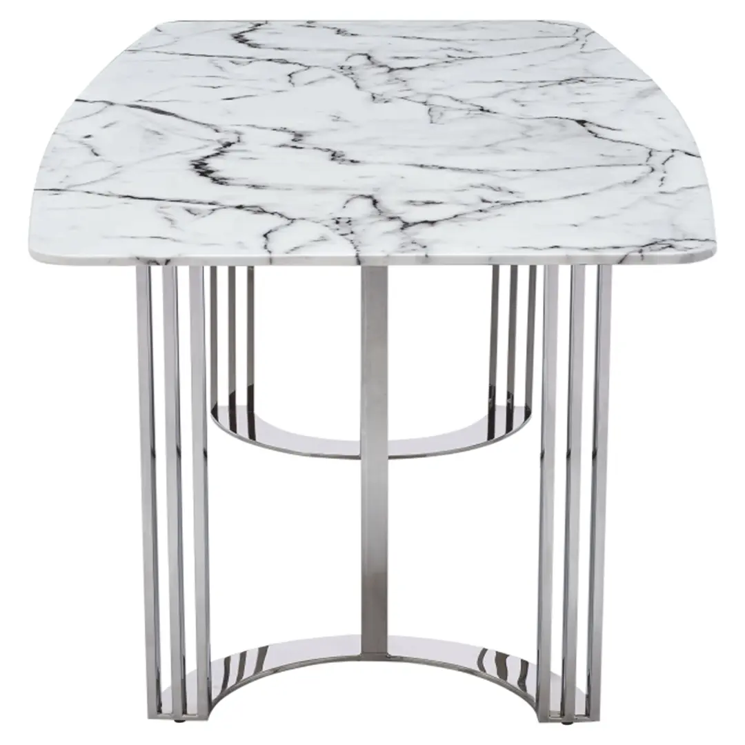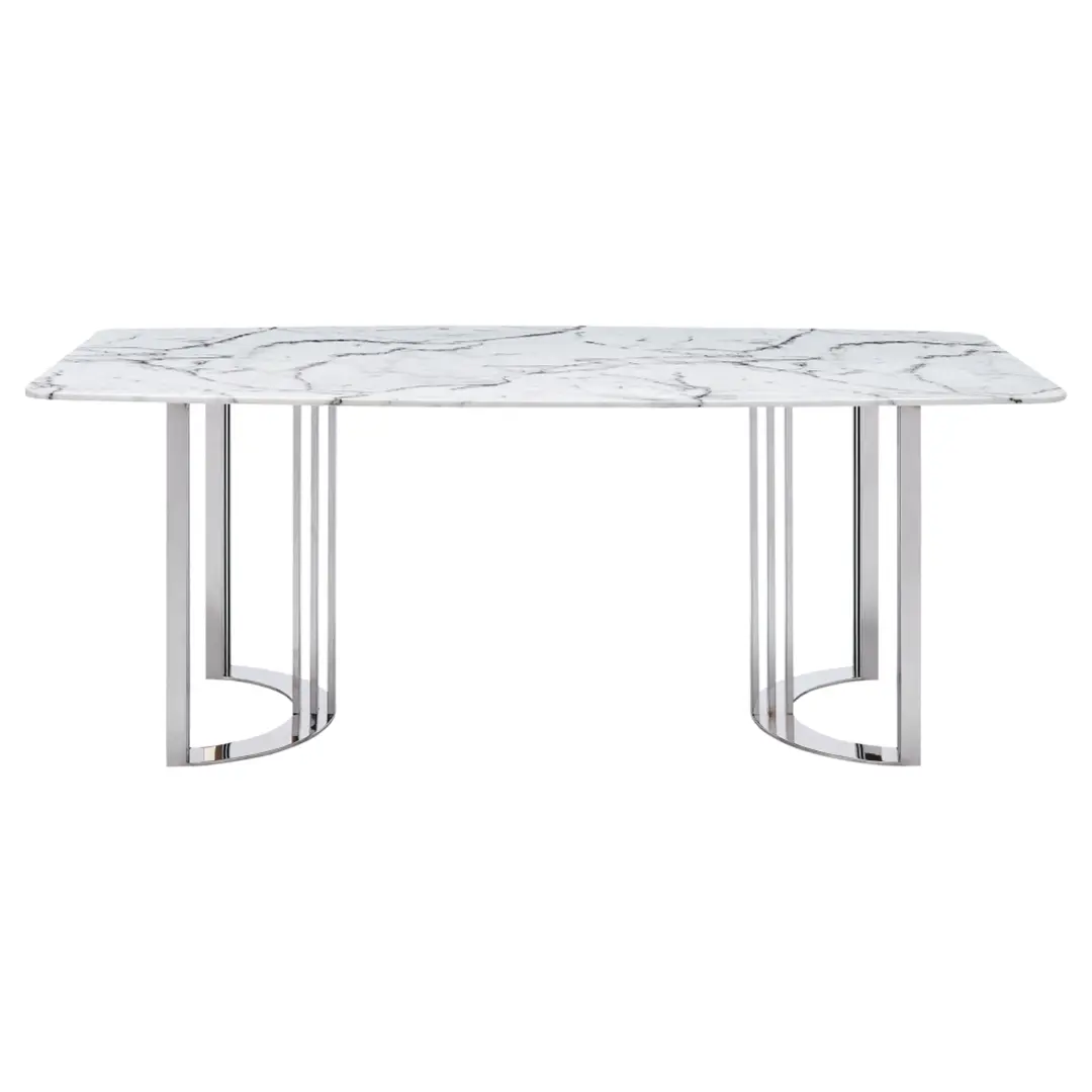 - Marble Dining Table: A striking 12mm marble top rests confidently upon a sculptural stainless steel silver-color base — bold yet sleek for sophisticated appeal.