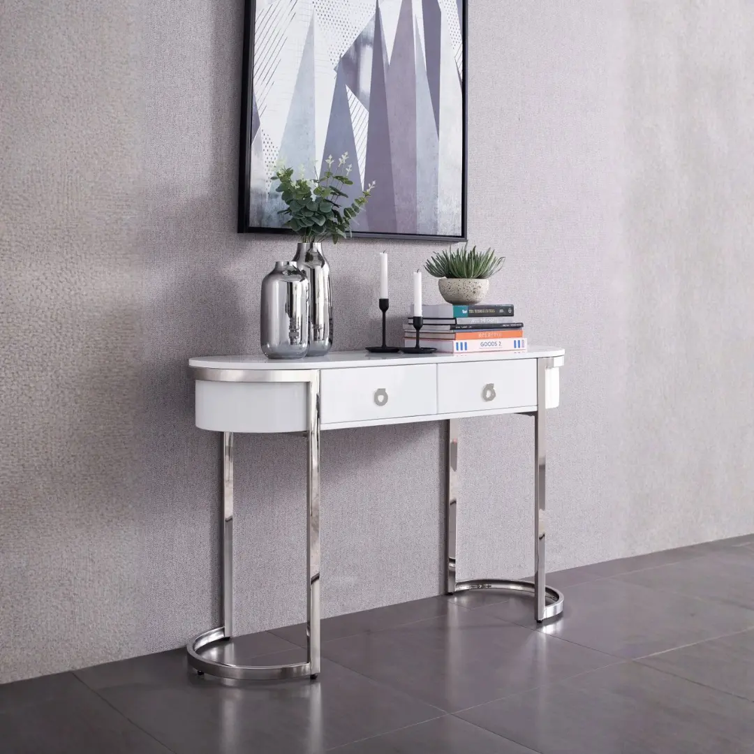 - Buffet Cabinet: Features a white high-gloss finish and stainless steel base — a flawless companion that offers ample storage with style.