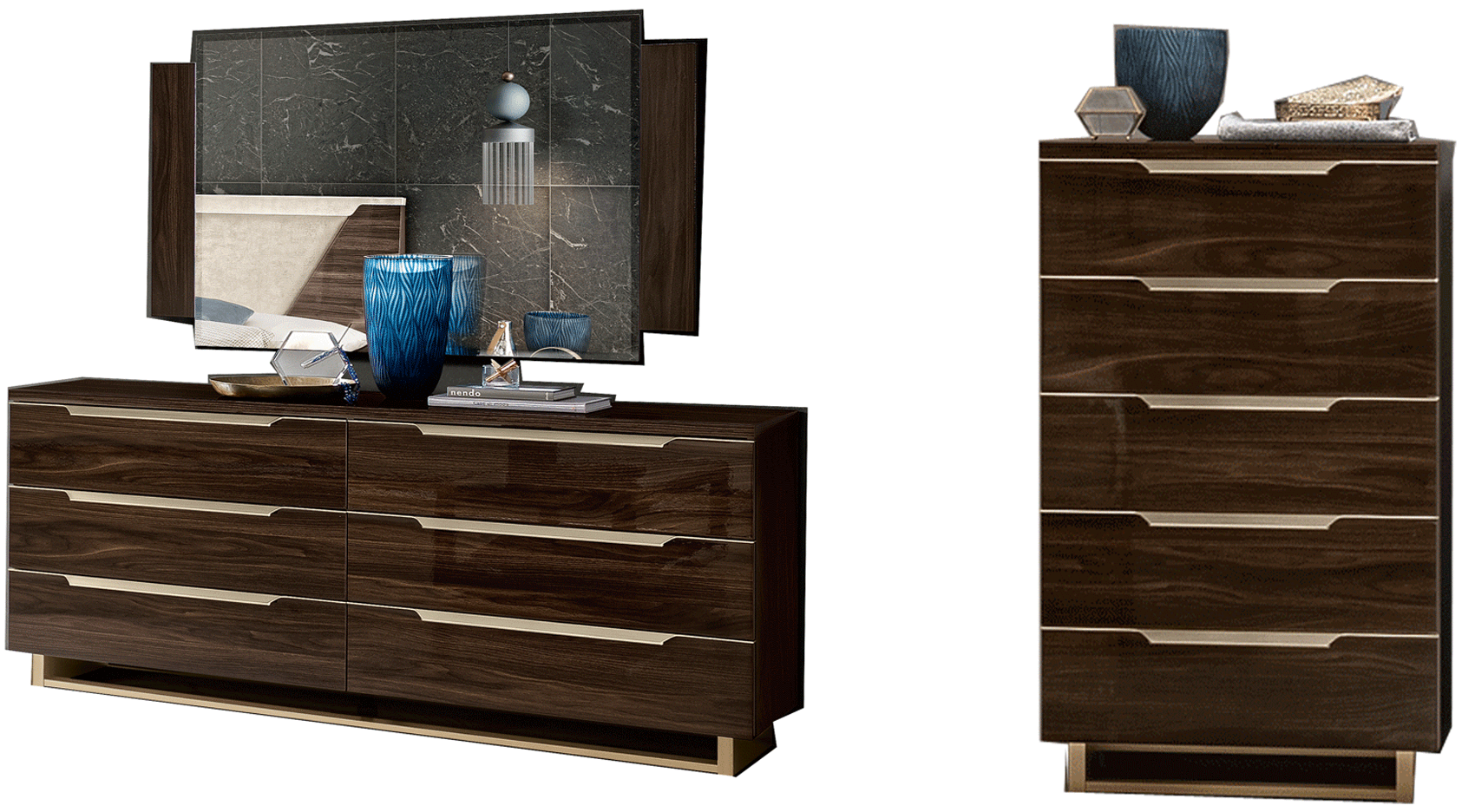 High Gloss Lacquer, Mat Smart Double dresser w/ mirror and chest Walnut p12684 By ESF Furniture