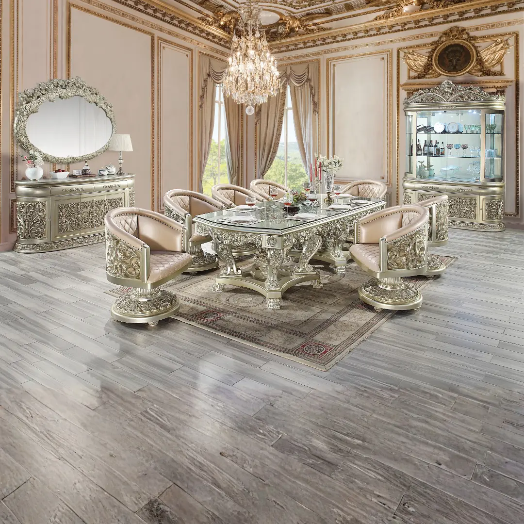 Designed to complement the scale and luxury of grand dining spaces, the chair measures a generous 31″L x 28″W x 38″H, with curved armrests and carved cabriole legs that reflect ornate baroque influences. Whether placed at the head of the table or used as an accent piece in a formal living area, it adds an unmistakable note of distinction.