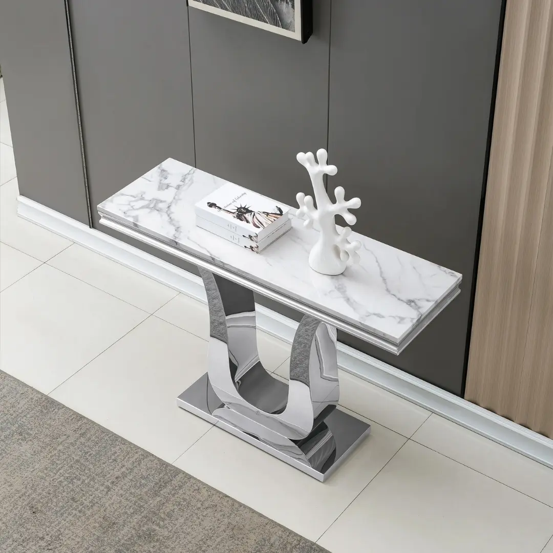 Whether positioned beneath a gallery of art or as a standalone feature, the ST3102 Console Table transforms any space. Its reflective base and luxurious marble top introduce contrast, dimension, and a sense of scale in both open-plan and compact environments. Pair with metallic accessories, sculptural vases, or statement mirrors for a curated designer look.