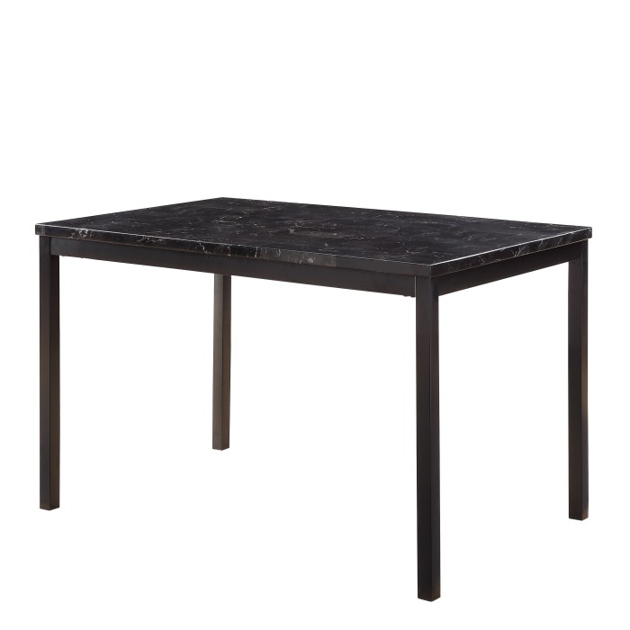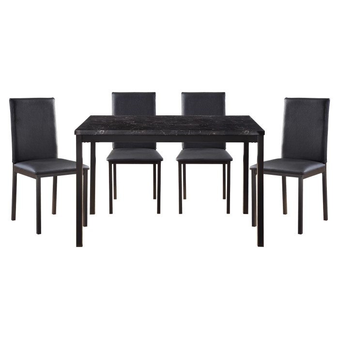 Bring style, comfort, and functionality into your home with the Tempe mid century dining room set by Homelegance. Perfectly scaled for smaller dining areas, this set combines a rich faux marble tabletop with sleek black metal construction and minimalistic faux leather chairs. The transitional design blends mid-century modern lines with a contemporary aesthetic, creating a versatile set that fits seamlessly into any modern or urban home.