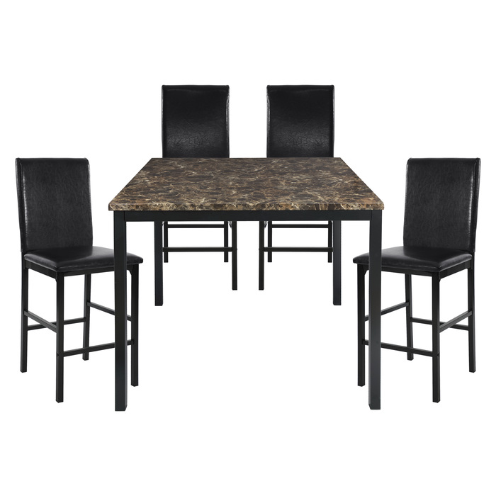 - Material: Table — faux-marble / engineered stone-look top, metal base & legs; Chairs — metal frame, faux-leather upholstery (100% polyester)