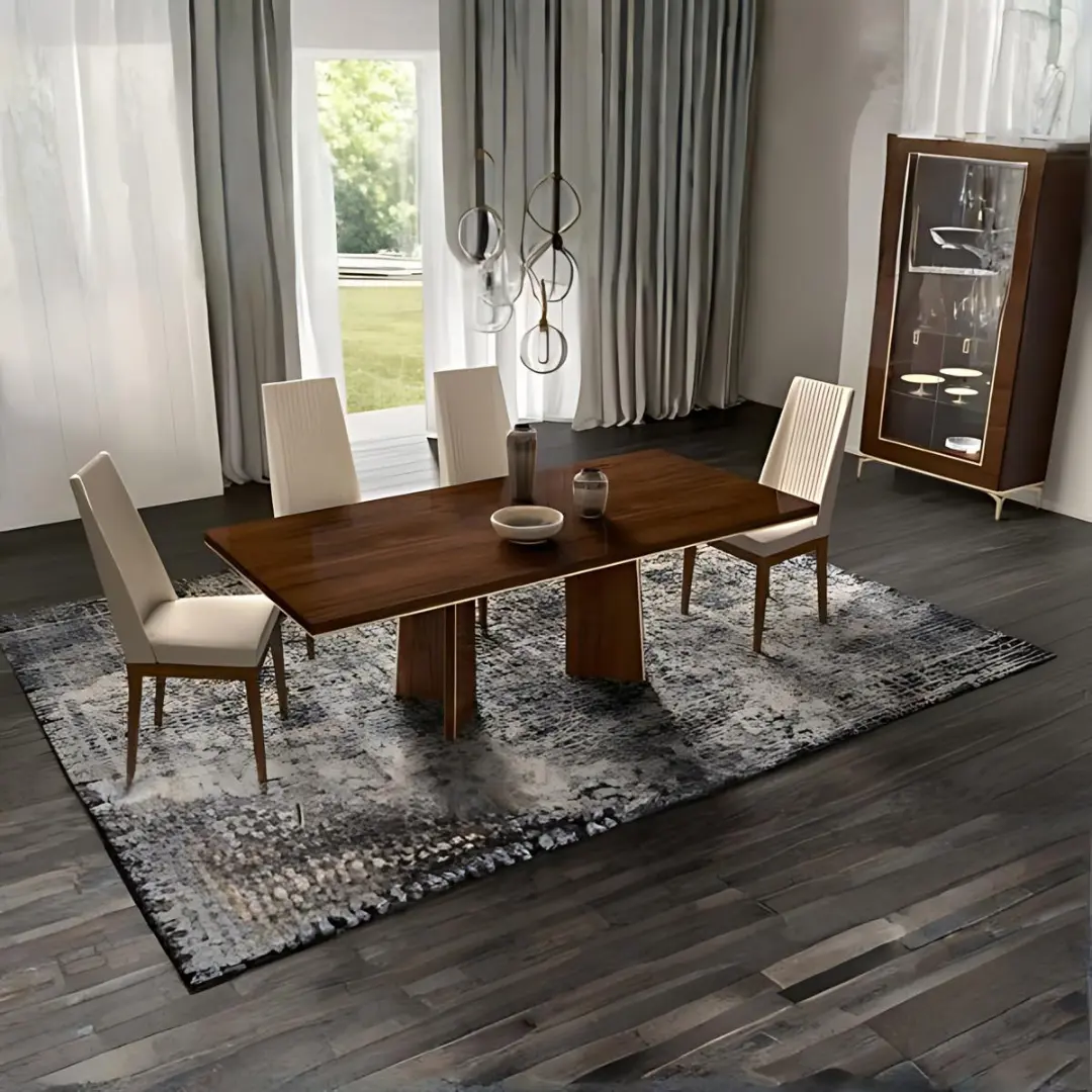 Welcome to the exquisite “Eva” dining room, a space that exudes timeless elegance and a warm, inviting ambiance with its stunning tobacco walnut finishes. Step into this refined setting, where classic design and natural beauty harmoniously come together to create an unforgettable dining experience.