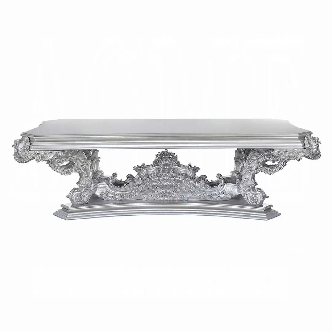 Finished in Antique Platinum with an understated gray undertone and gold trim accents, the Valkyrie dining table showcases meticulous scrollwork and floral carvings that immediately capture attention. Constructed with high-quality resin and composite wood, the table reflects both durability and artistry — ideal for discerning homeowners with a taste for time-honored luxury.