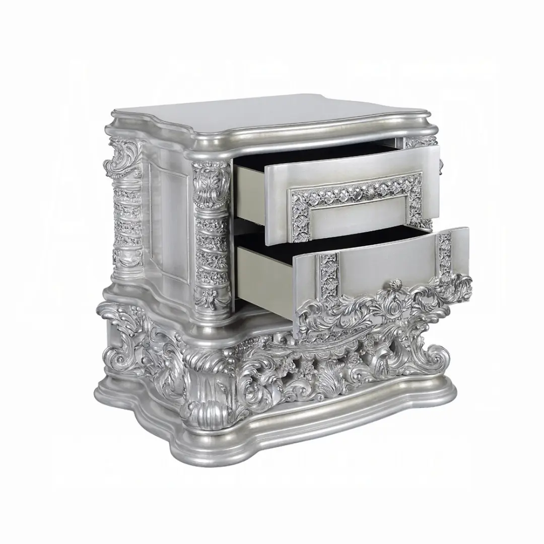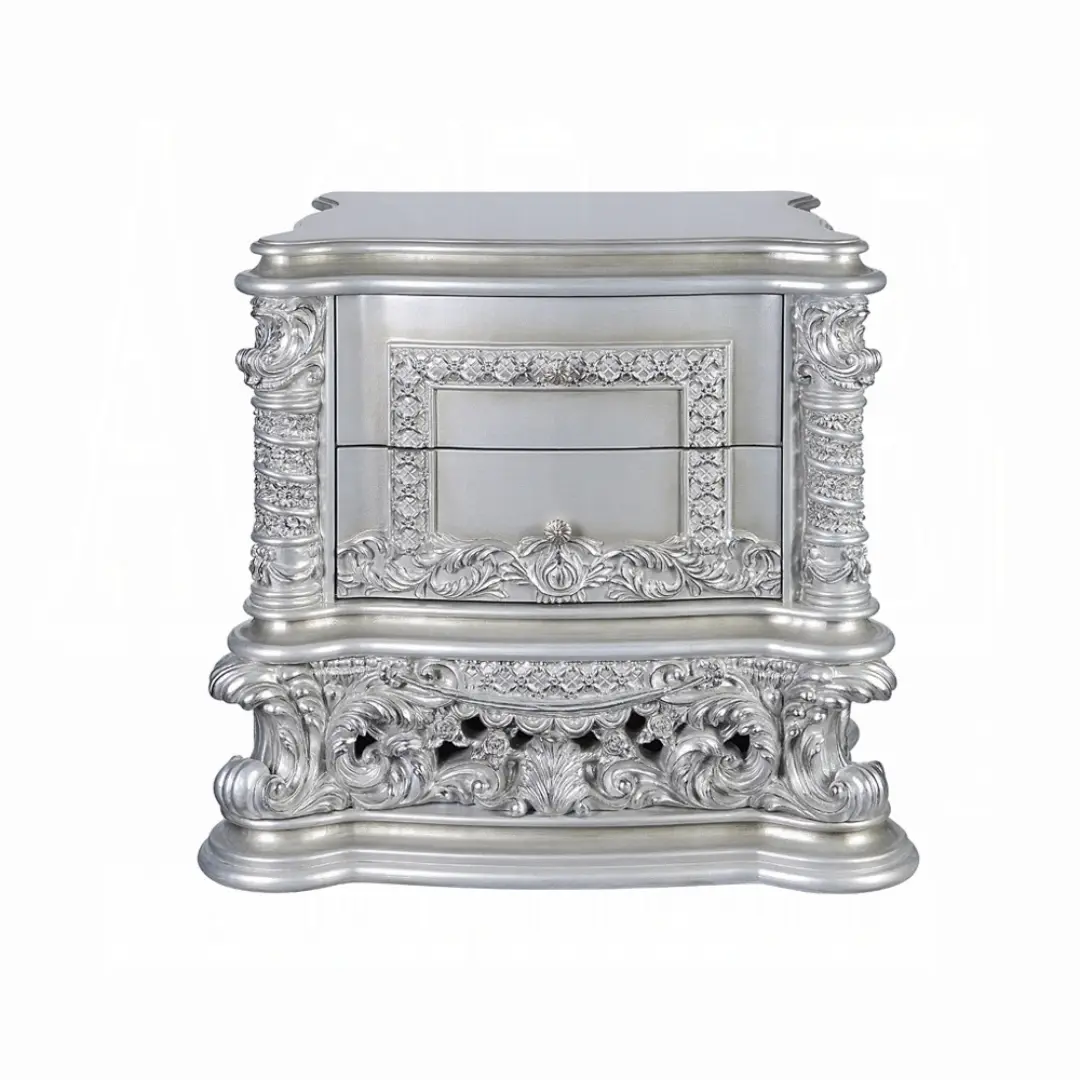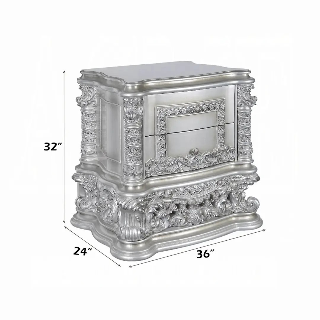 Elevate your bedroom with the Valkyrie Platinum Nightstand by ACME, a masterwork of transitional luxury. Designed for those with an appreciation for classic artistry blended with understated modern flair, this nightstand features exquisite craftsmanship, antique aesthetics, and advanced functionality. Its statement Antique Platinum finish and intricate floral scrollwork encapsulate the grandeur of the Valkyrie Bedroom Collection, making it the ideal addition for those curating a refined interior.