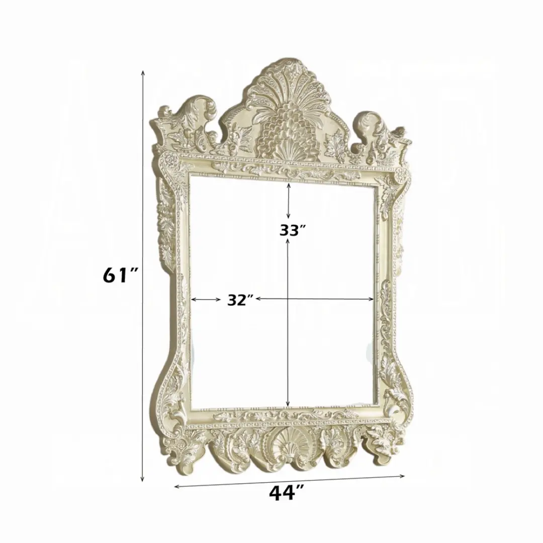 The Champagne Mirror showcases intricate scrollwork and sculpted detailing inspired by classic European design. Its soft champagne silver tone adds brightness and sophistication, making it an ideal accent for elegant bedrooms.