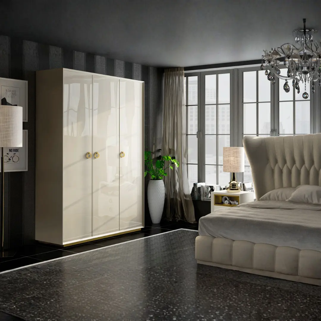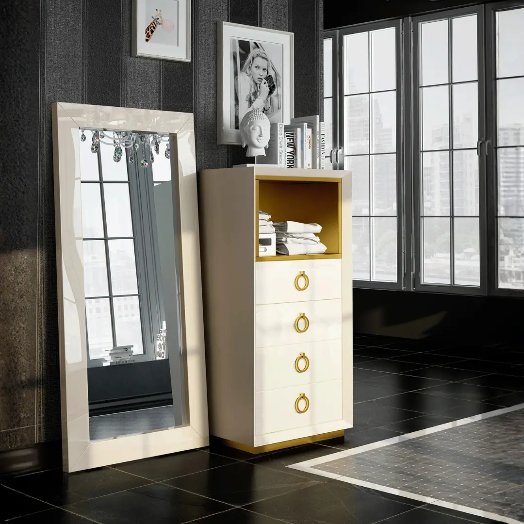 - Nightstands, Dresser & Chest: Feature a matte beige carcass paired with high gloss cream fronts and adorned with matte gold Anilla handles for a luxurious finish.