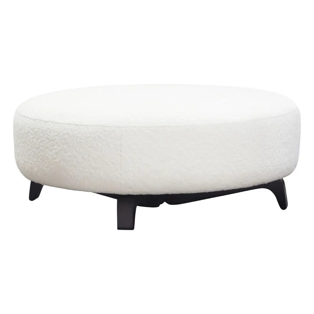 The Vesper round ottoman stands out with its soft faux shearling upholstery, bringing both texture and warmth to your décor. This fabric not only looks luxurious but also feels incredibly comfortable.