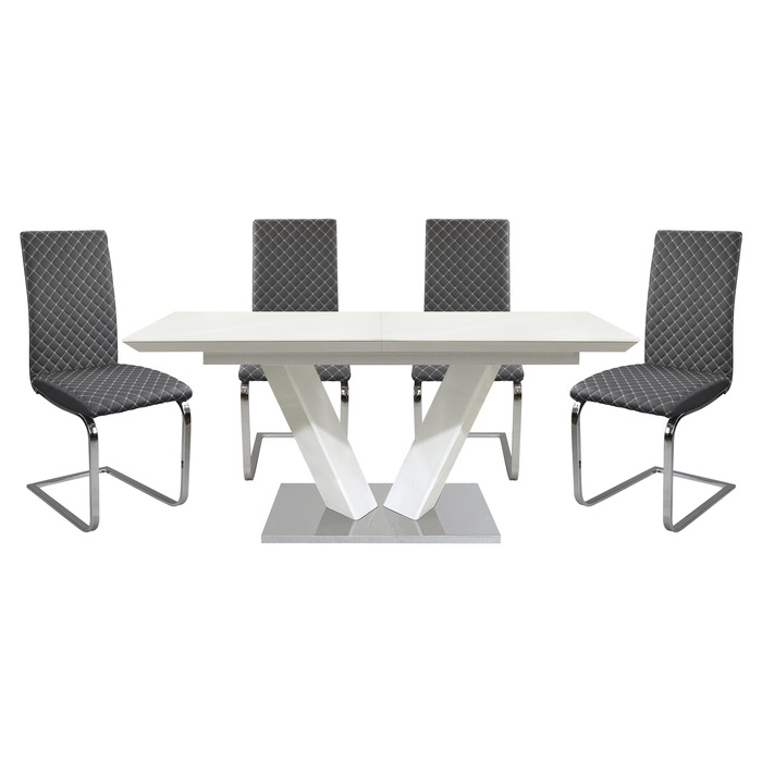 At the center of the set is a stunning dining table featuring an ultra-bright white high gloss tabletop that reflects light beautifully, creating a clean and expansive feel. The smooth glide system allows the table to extend effortlessly, revealing a self-storing butterfly leaf ideal for hosting guests.